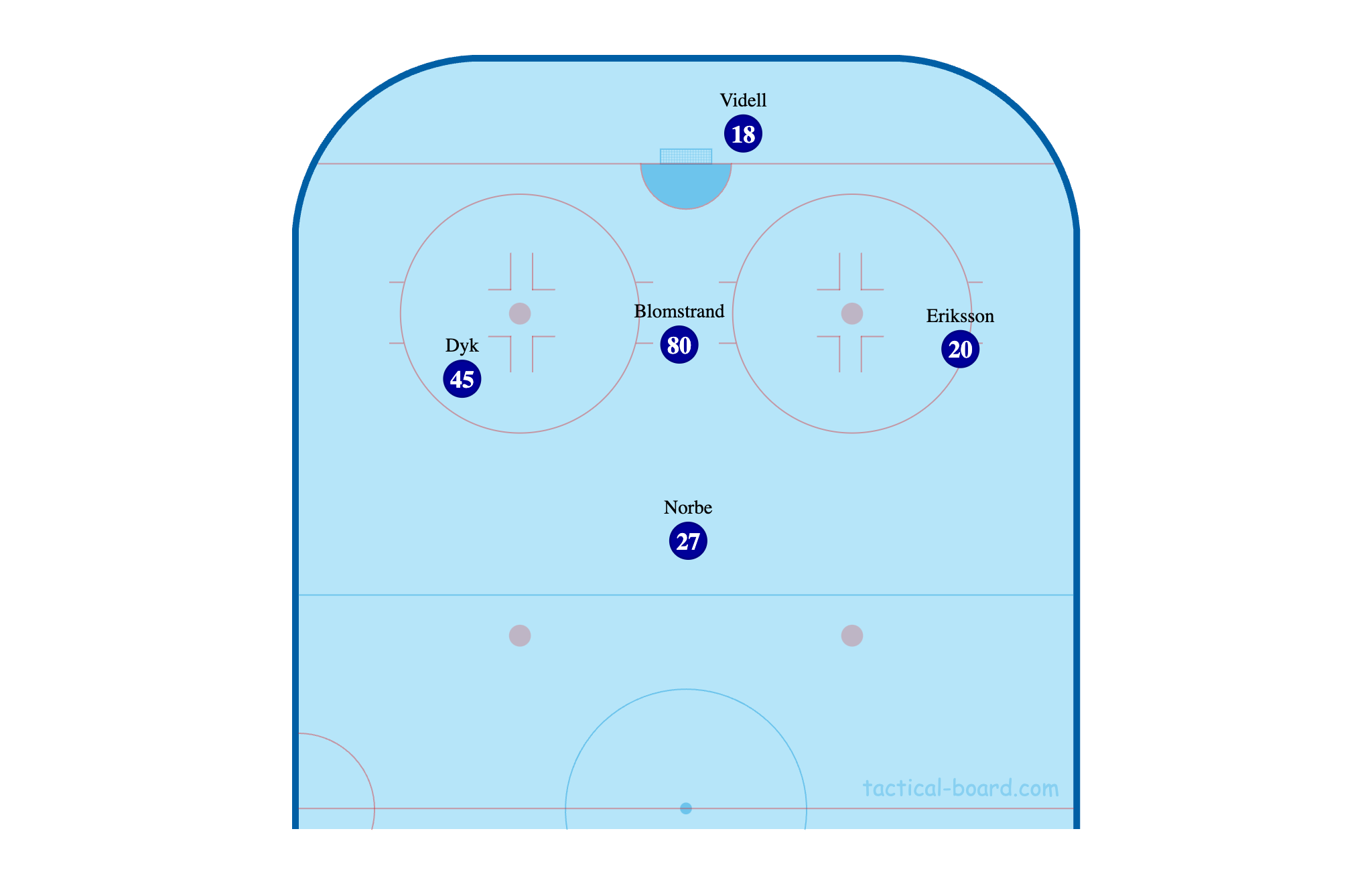 Grunden är samma uppställning som startar flest PP idag, Videll, Norbe och Blomstrand, men med den adderade kryddan av Dyk i slottet och Eriksson längs med förlängda mållinjen. Försvarande lag kan inte längre räkna med att Blomstrand kommer skjuta när han får pucken för då kan han istället hitta ett enkelt instick till Dyk eller spela ner till Eriksson. Och likaså går det inte att gå för hårt för att försvara centrallinjen för en passning från Videll över till Blomstrand för då finns Eriksson som alternativ. Eftersom Dyk är rightare blir det svårt för Videll att passa honom för direktskott men förra säsongen såg vi ofta Pasic göra en hybrid av passning och skott som var menat för styrning vilket skulle kunna vara ett alternativ istället. Och Dyk är i optimal position för passningar från Eriksson bakom mål. Det finns också möjligheten att vrida uppställningen vilket skapar en annan dynamik och gör det svårt för motståndarna att scouta i förväg. I den här roterade varianten byggs istället spelet från högersidan och Dyk får en viktig roll som skytt efter passningar från Videll och Eriksson. Jag är inte lika förtjust i den här varianten men det kan som sagt vara bra att ha att plocka fram för att bli mer svårlästa.